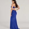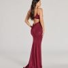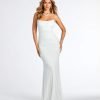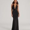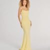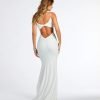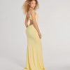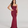 Make a dreamy entrance at your next formal affair in the stunningly glam Rowan formal glitter ruched mermaid dress! Crafted from a glitzy glitter knit fabric for an enchanting sparkle. she features a sleeveless scoop neckline. spaghetti straps. a lower back cutout to add a stylish flair. ruching at the back and down the side seams to accentuate your curves. and a floor-sweeping hem with a mermaid silhouette. Complete your look in this formal long dress with rhinestone fringe earrings.