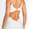 - Lower back cutout. ruching at the back and down the side seams