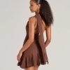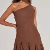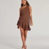 • Mini-length asymmetric pleated ruffled hem. A-line fit